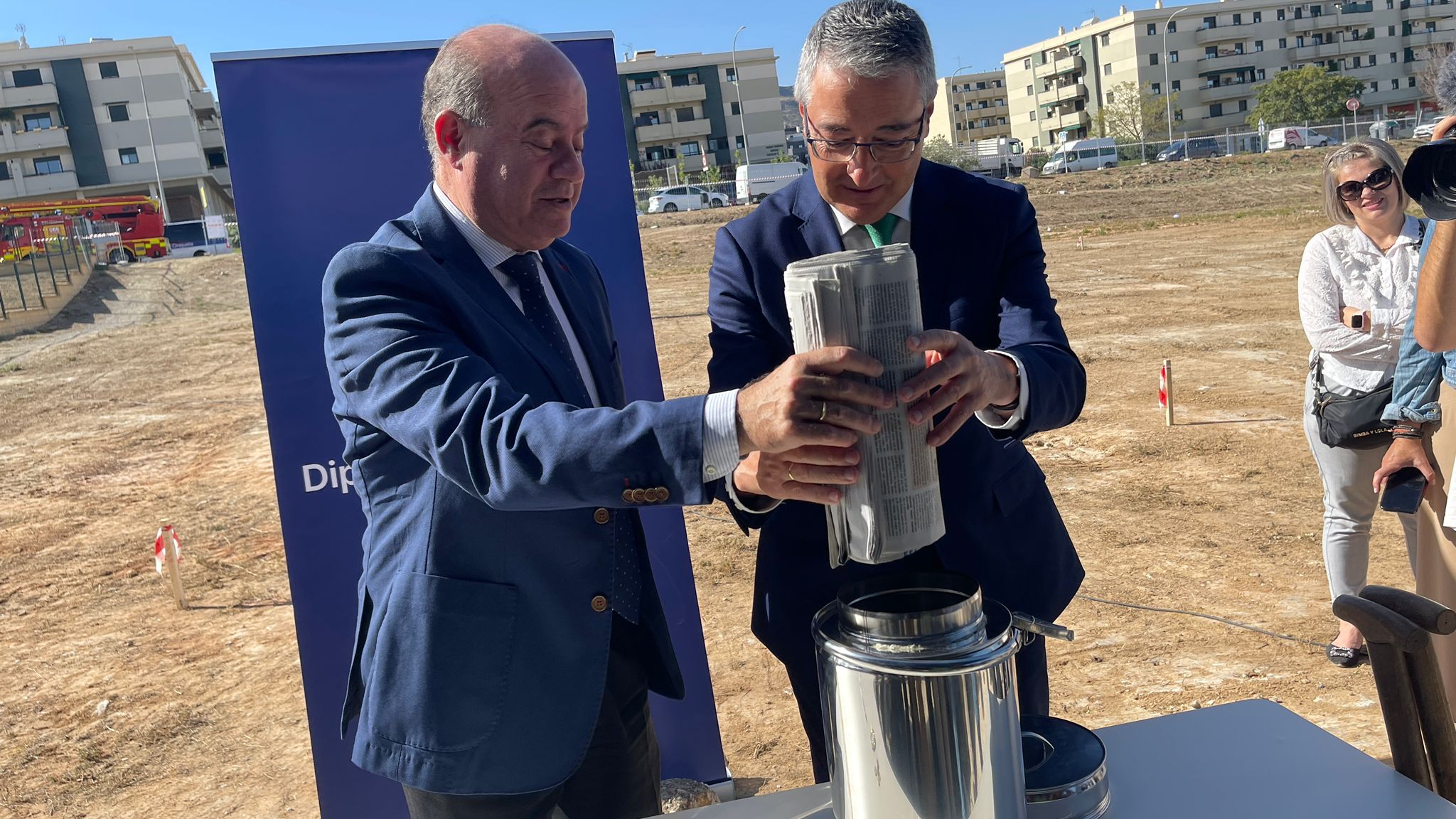 El presidente de la Diputación de Málaga, Francisco Salado, y el alcalde de Antequera, Manuel Barón, han participado hoy en el acto de colocación de la primera piedra de esta nueva infraestructura del Consorcio Provincial de Bomberos (CPB), cuyas obras se adjudicaron a la UTE Invesia Construcción y Servicios, SL y Azogue Ingeniería, SL.